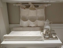 Utilize as prateleiras e gavetas do armário para acomodar os lençóis, mantas, cobertas, cueiros, fraldas de pano e toalhas de banho, assim facilita nas trocas e evita que se misturem aos enxovais da casa ou se percam em outros armários.
