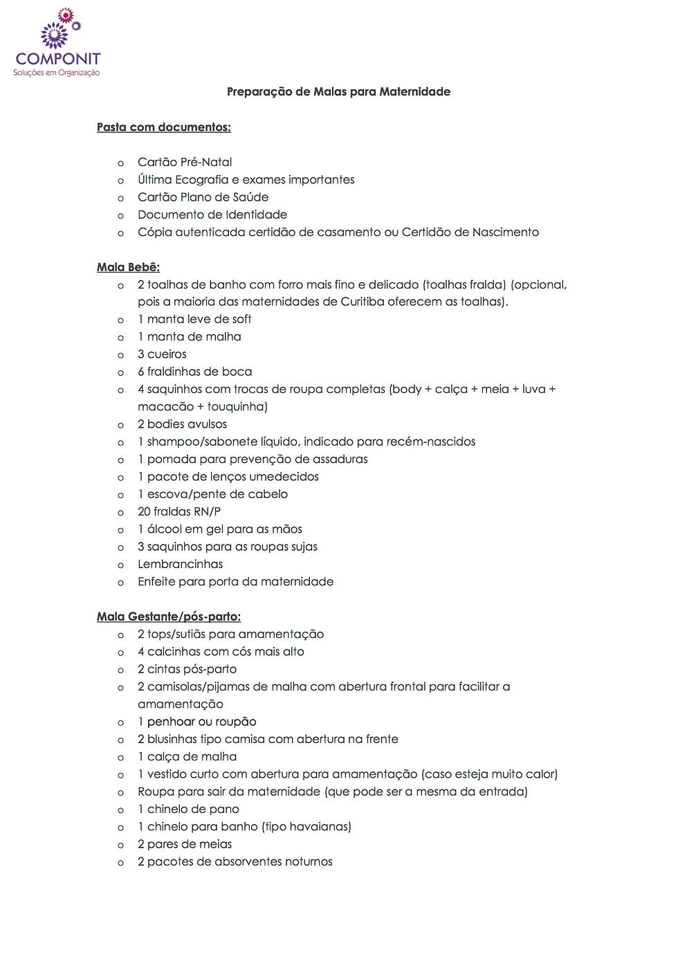 Para o parto normal ou cesárea em Maternidades, especialmente na cidade de Curitiba, este seria o passo-a-passo para organização de malas práticas e completas.